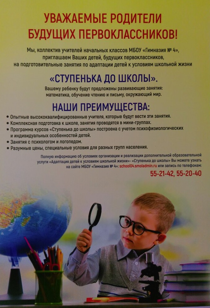 Уважаемые родители будущих первоклассников! Совсем скоро Ваш ребёнок станет первоклассником. Вы с волнением строите планы на будущее. Как бы хотелось, чтобы школа стала вторым домом, учитель – добрым, мудрым наставником, одноклассники – друзьями. Уже сейчас МБОУ «Гимназия № 4» начинает набор на подготовительные курсы «Ступенька до школы».